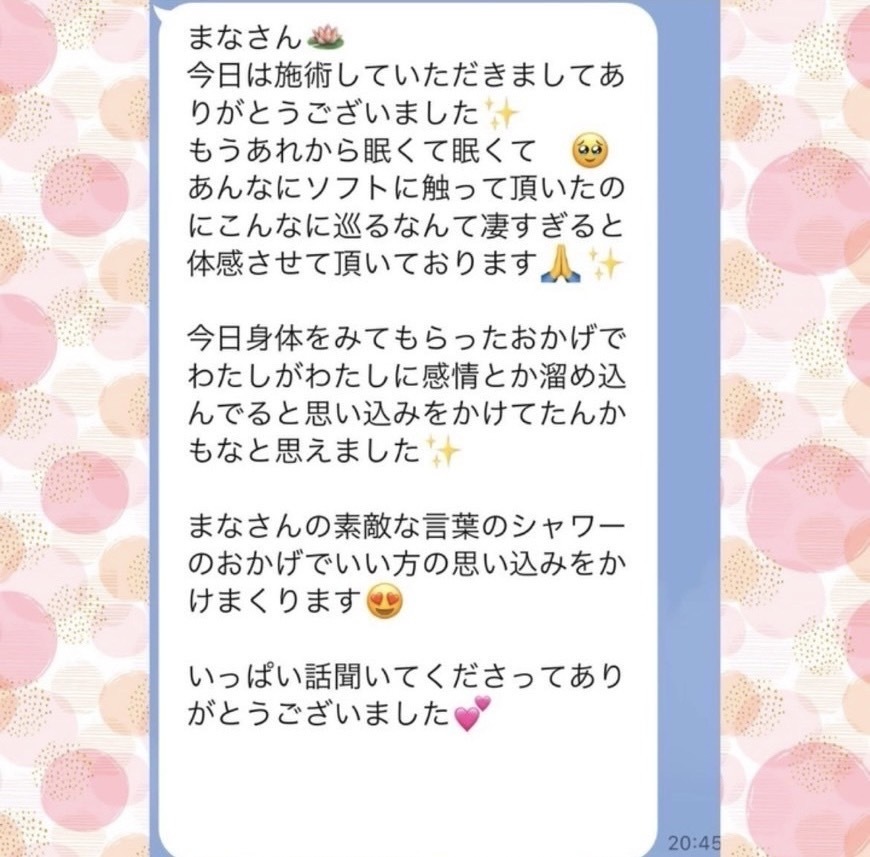 全身骨格調整、筋肉調整、内臓調整、チャクラ調整を行います。 「一度、施術を体験してみたい」という初回の方にもおすすめです。 障害をお持ちの方にも対応しています。 |
